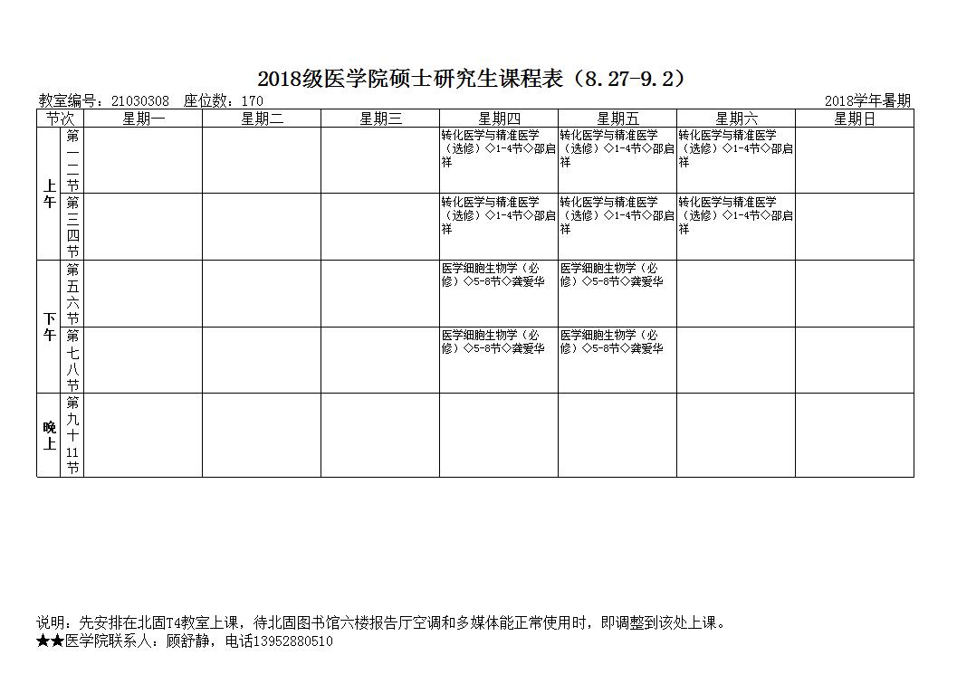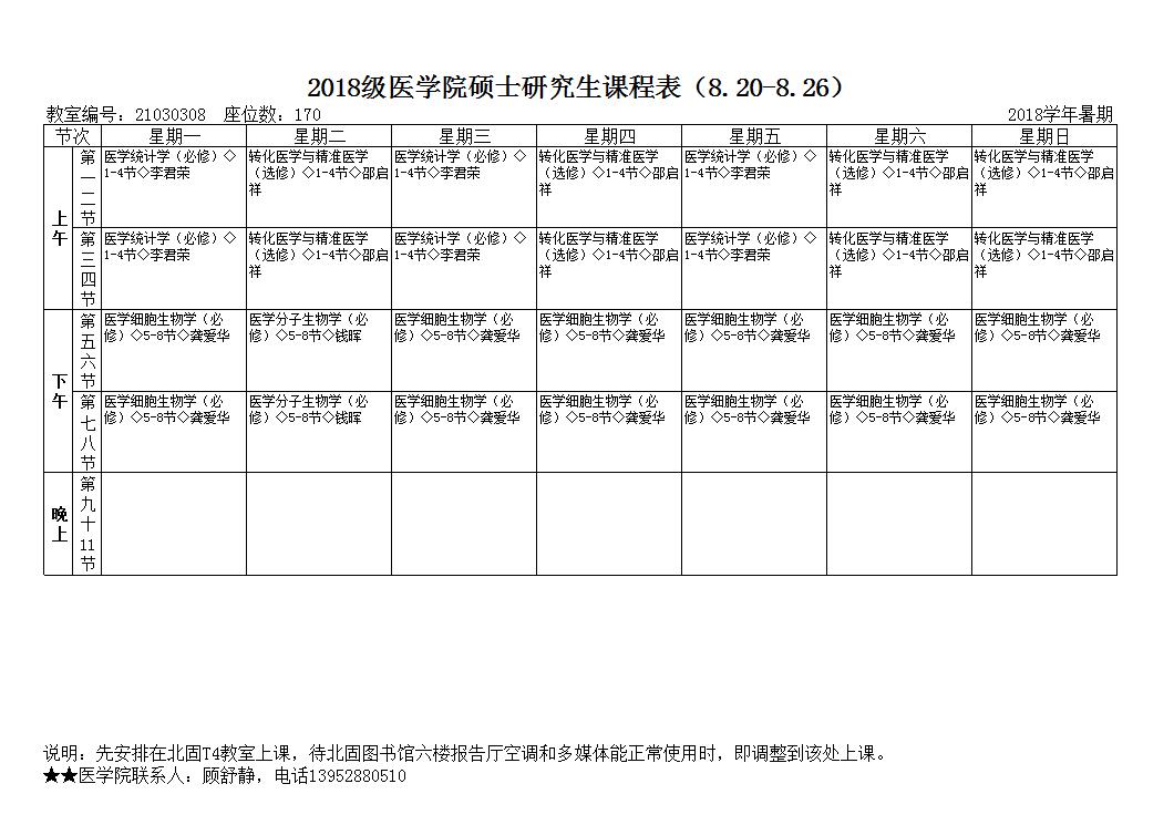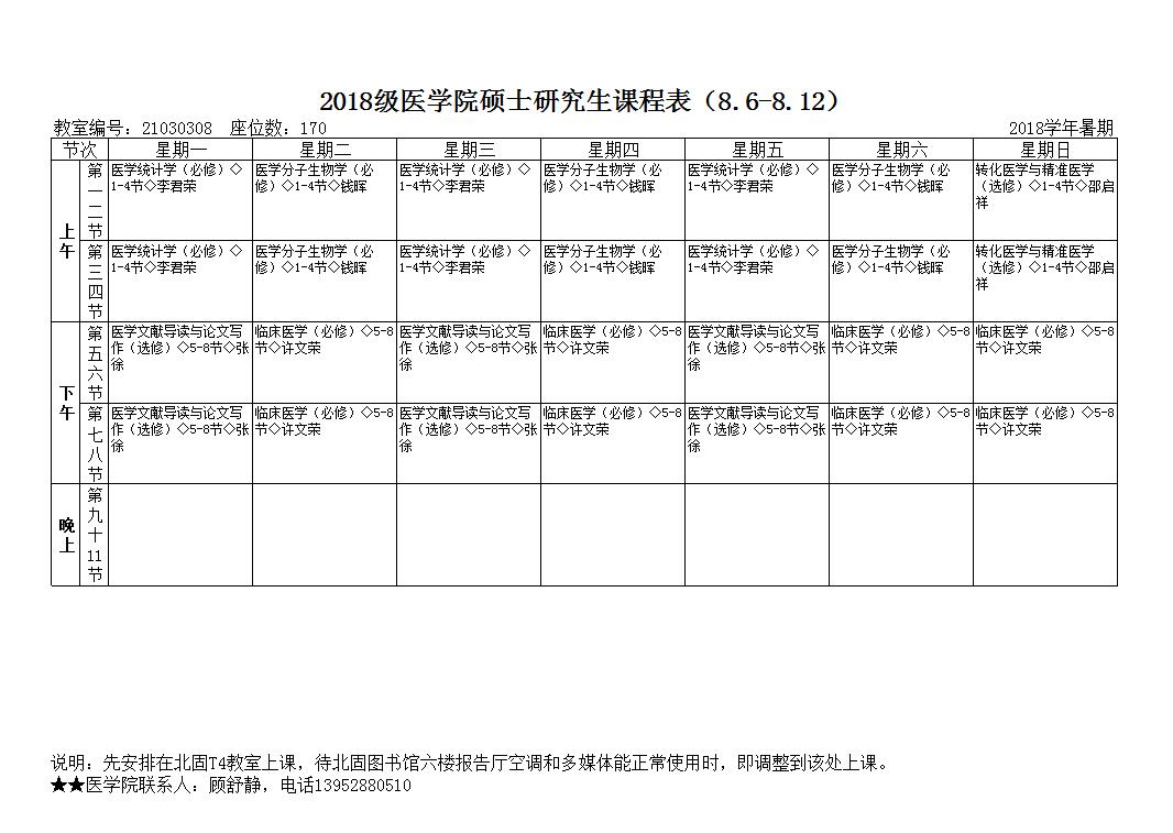因天气炎热,在北固图书馆六楼报告厅空调和多媒体未能正常使用前,本课表之课程全部调至门诊五楼北教室上课。
