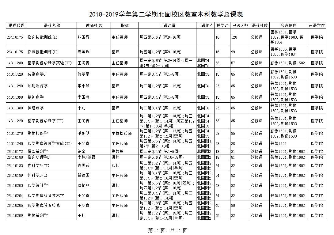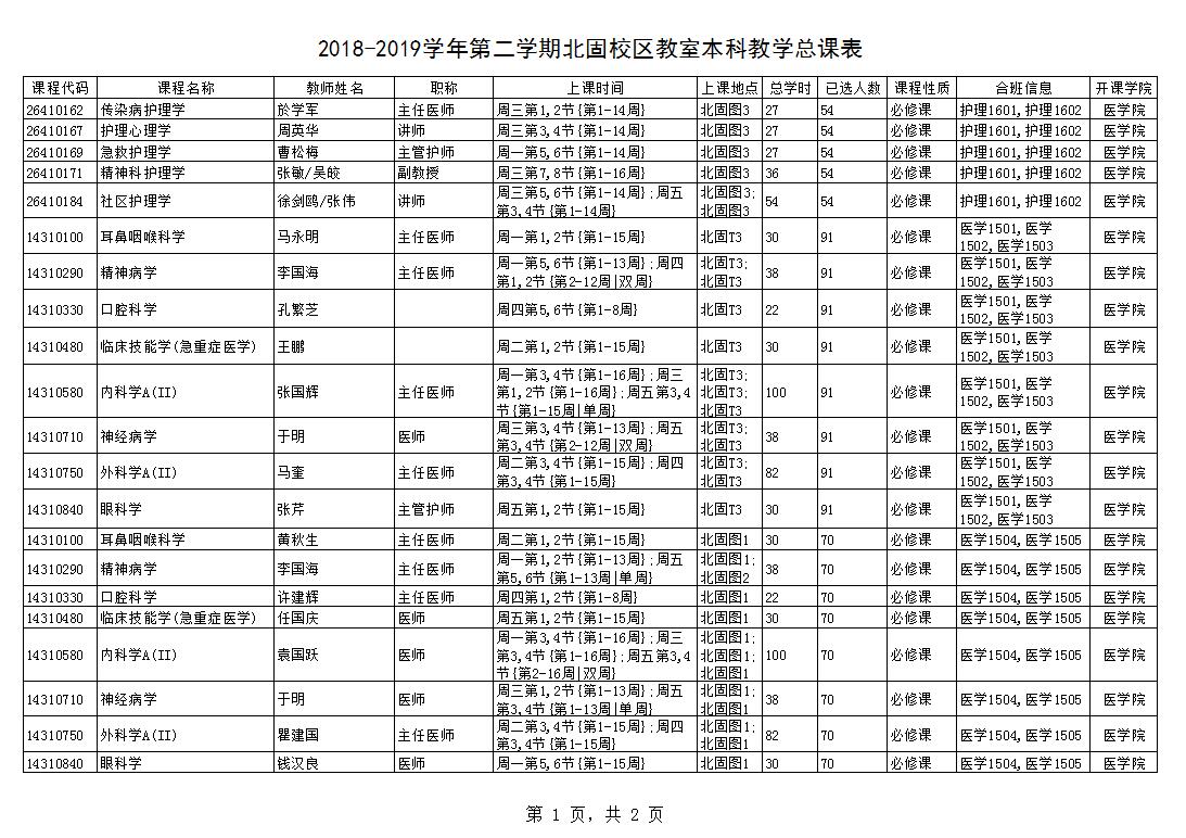 2018-2019学年第二学期北固校区教室本科教学课表